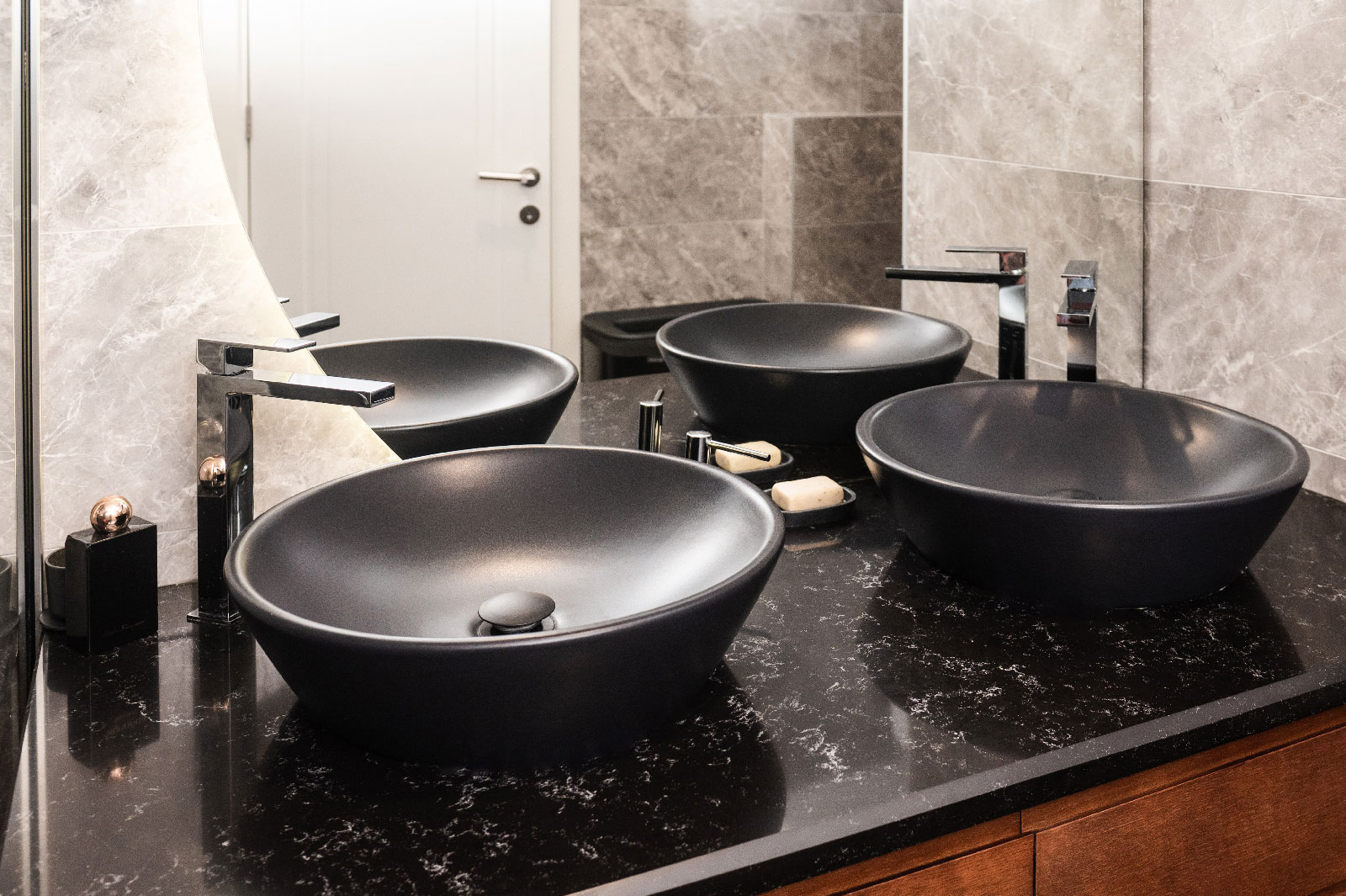 Kupatilski namještaj po mjeri omogućava stvaranje prostora koji je estetski privlačan i u potpunosti prilagođen potrebama korisnika. Mogućnost izrade je neograničena: konzolne komode, vitrine na nogare, ormarići i police različitih dimenzija, ogledala i razna rješenja za optimalnu organizaciju. Raznovrsni materijali i stilovi omogućavaju usklađenost svih elemenata kupatila, stvarajući harmoničan i elegantan ambijent.
