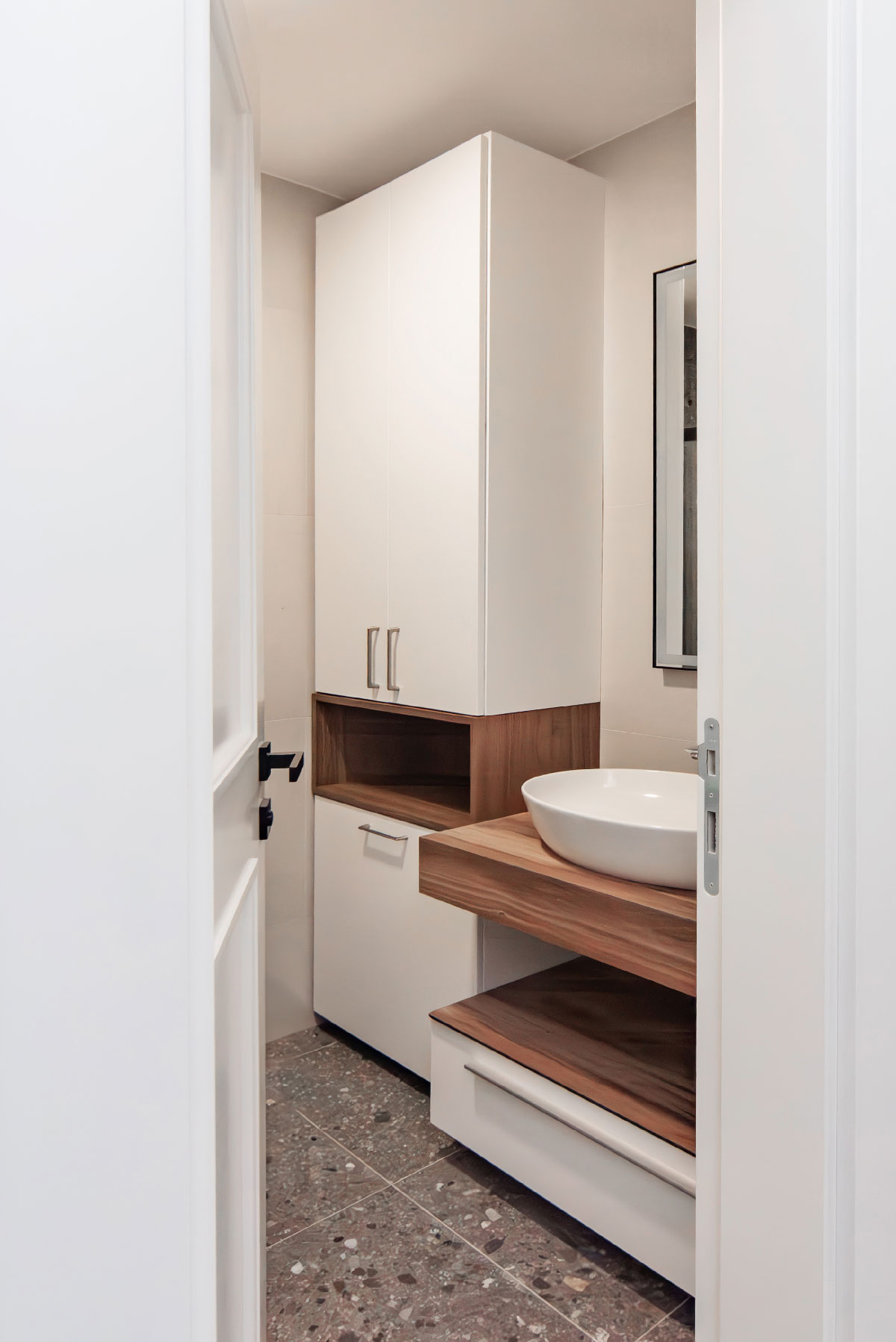 Kupatilski namještaj po mjeri omogućava stvaranje prostora koji je estetski privlačan i u potpunosti prilagođen potrebama korisnika. Mogućnost izrade je neograničena: konzolne komode, vitrine na nogare, ormarići i police različitih dimenzija, ogledala i razna rješenja za optimalnu organizaciju. Raznovrsni materijali i stilovi omogućavaju usklađenost svih elemenata kupatila, stvarajući harmoničan i elegantan ambijent.