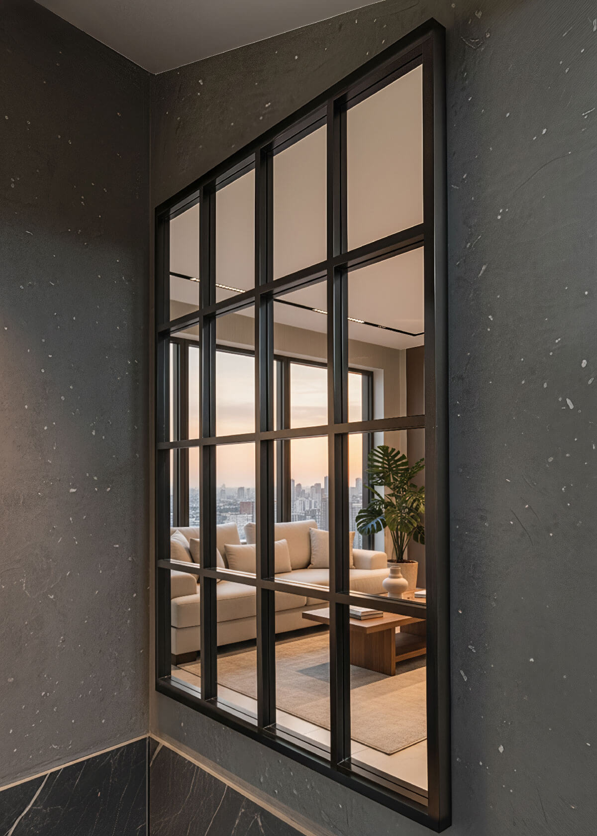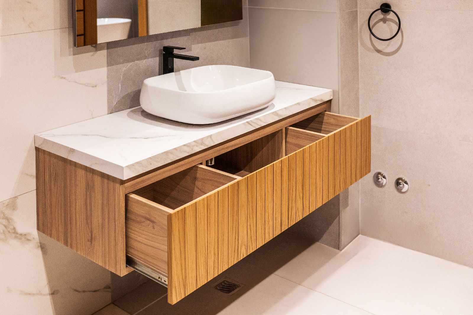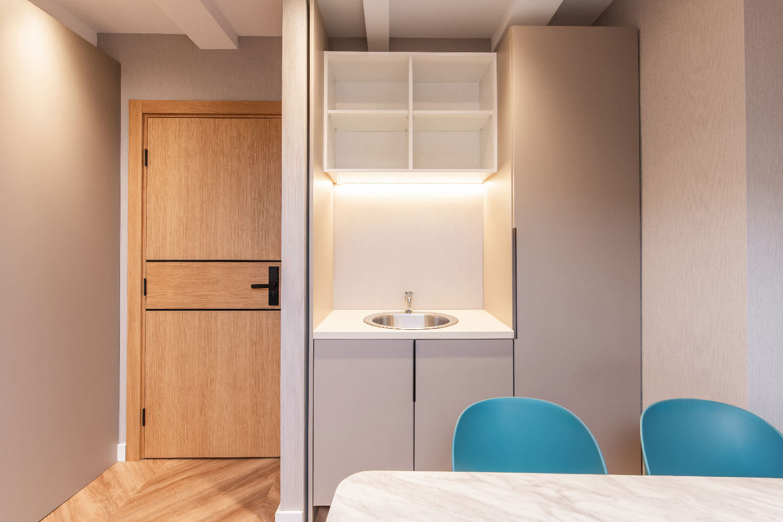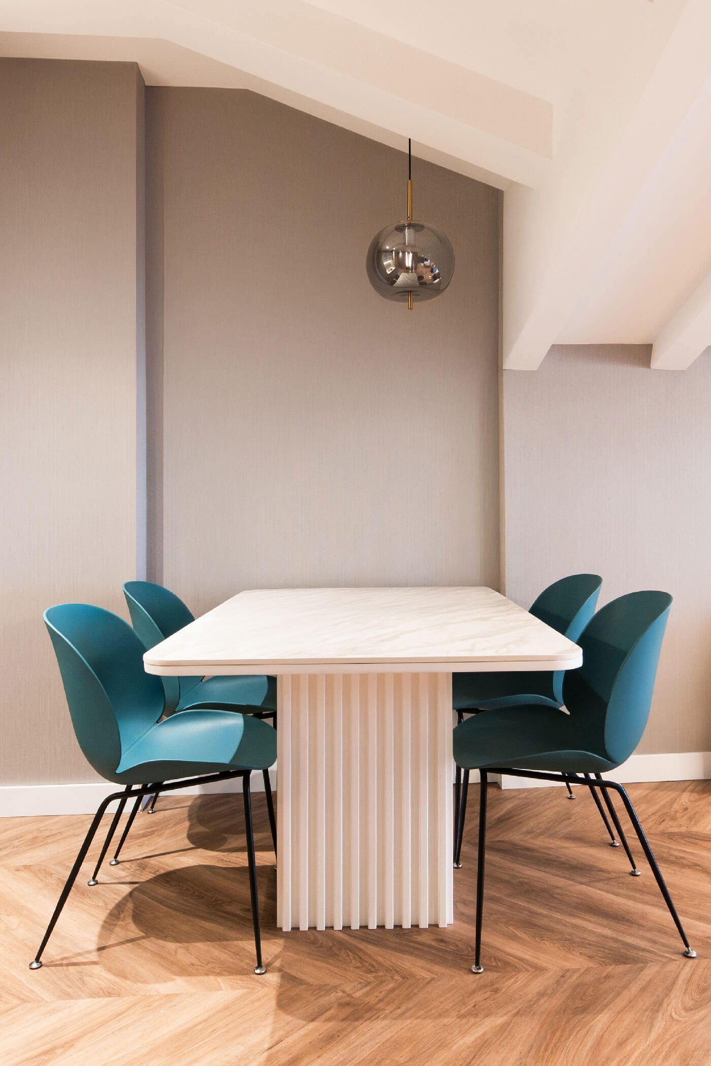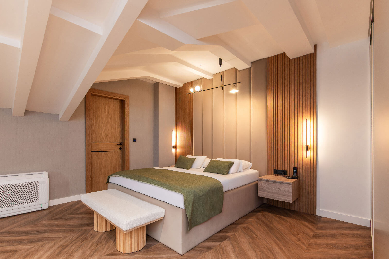 Vertikalne letvice se provlače kroz cijeli prostor, povezujući vizuelno svesegmente i unoseći dinamiku u dizajn. Pažljivo usklađeni detalji kuhinje,ormara, komoda i mini bara omogućavaju skladan, estetski privlačan prostor kojije istovremeno praktičan i moderan.