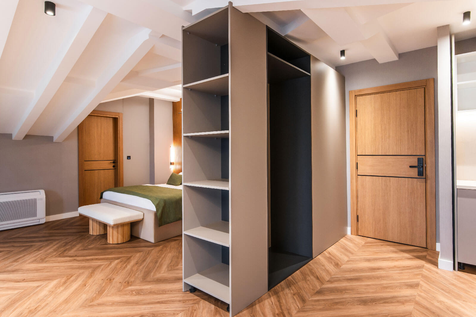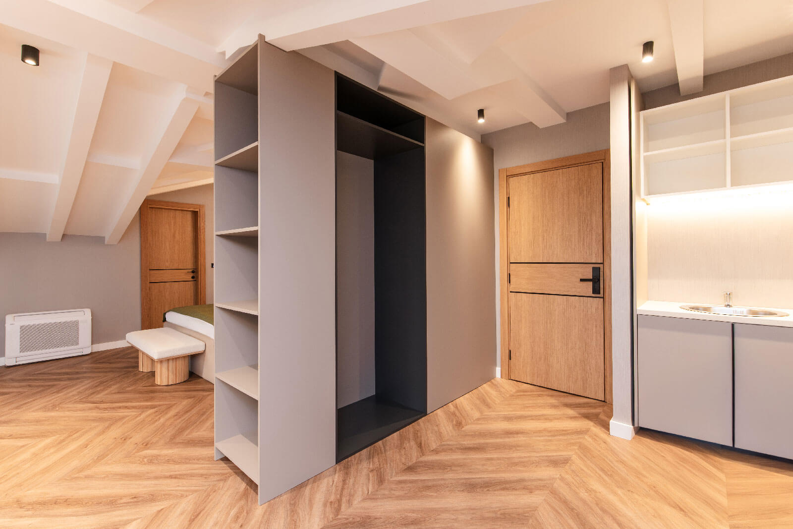 U ovom projektu realizovano je kompletno opremanjeapartmana sa modernim i toplim enterijerom, u kojem dominiraju hrastov furnir imedijapan u elegantnoj sivoj nijansi. Kombinacija ovih materijala stvarasofisticiran, ali prijatan ambijent, gdje svaki element doprinosi osjećajuelegancije i funkcionalnosti.