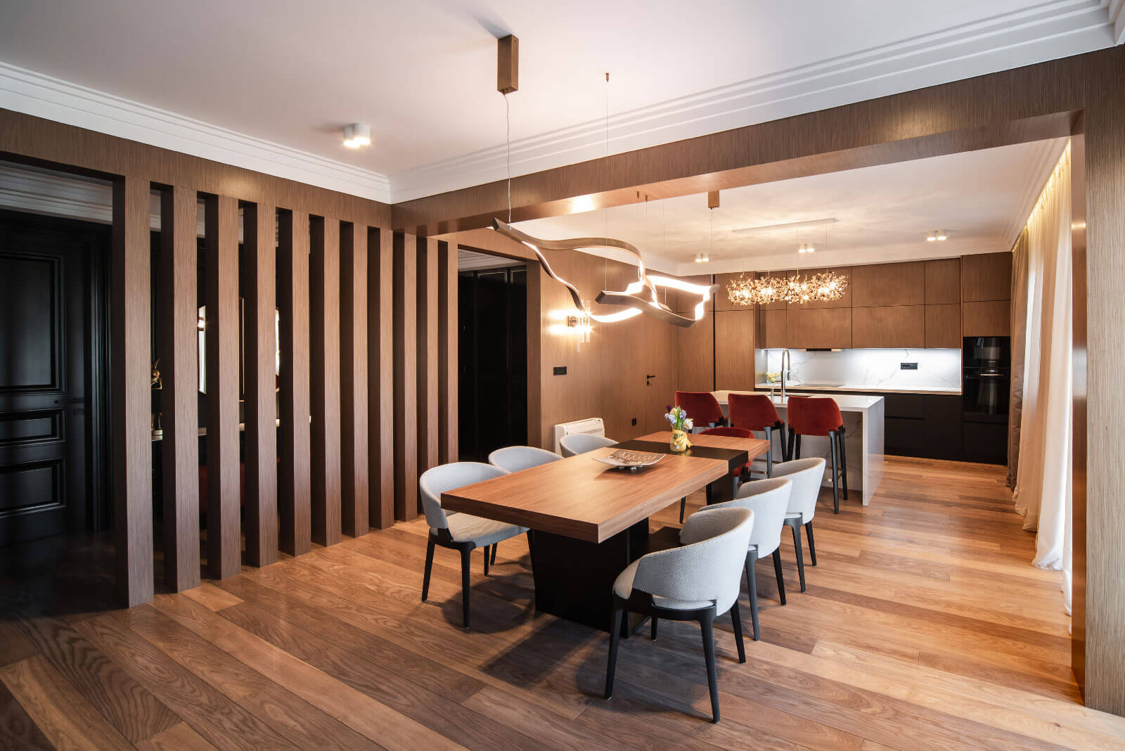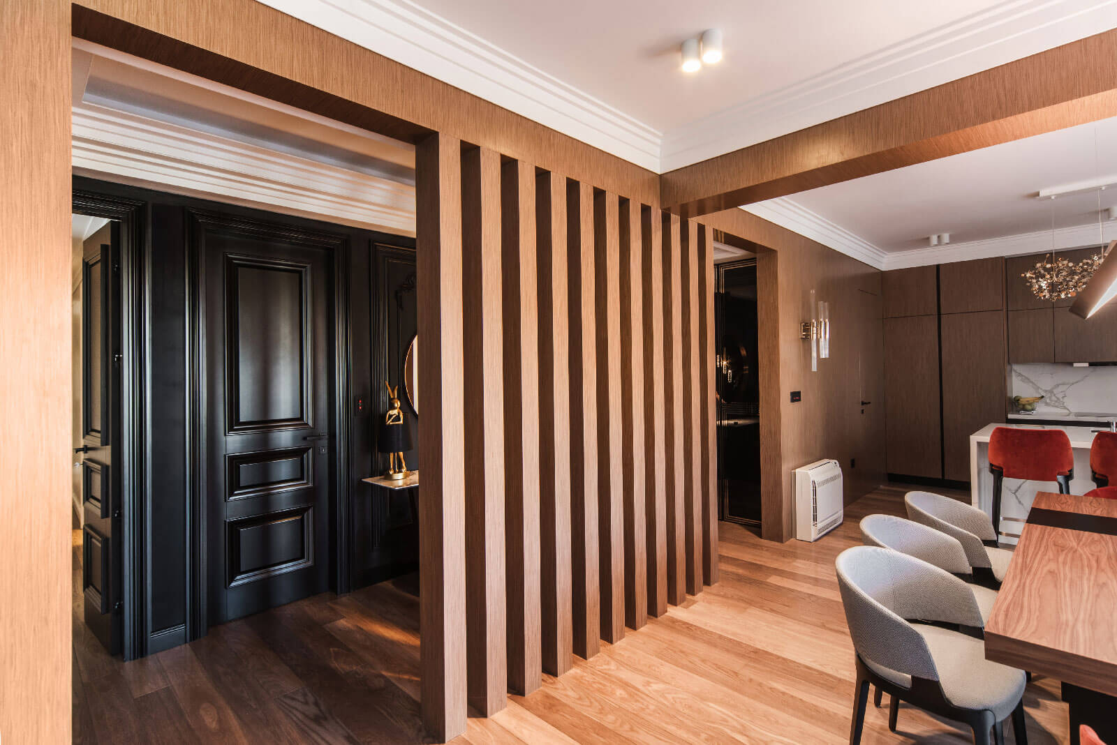 Pregrada izvedena pomoću drvenih stubova vizuelno razdvaja prostor, a istovremeno ga ne zatvara u potpunosti, zadržavajući prozračnost enterijera. Hrastov furnir se kontinuirano provlači kroz različite elemente – od stubova, preko zidnih obloga i skrivenih vrata, pa sve do kuhinje, gdje je kombinovan sa crnim medijapanom, stvarajući skladnu i zaokruženu dizajnersku cjelinu.