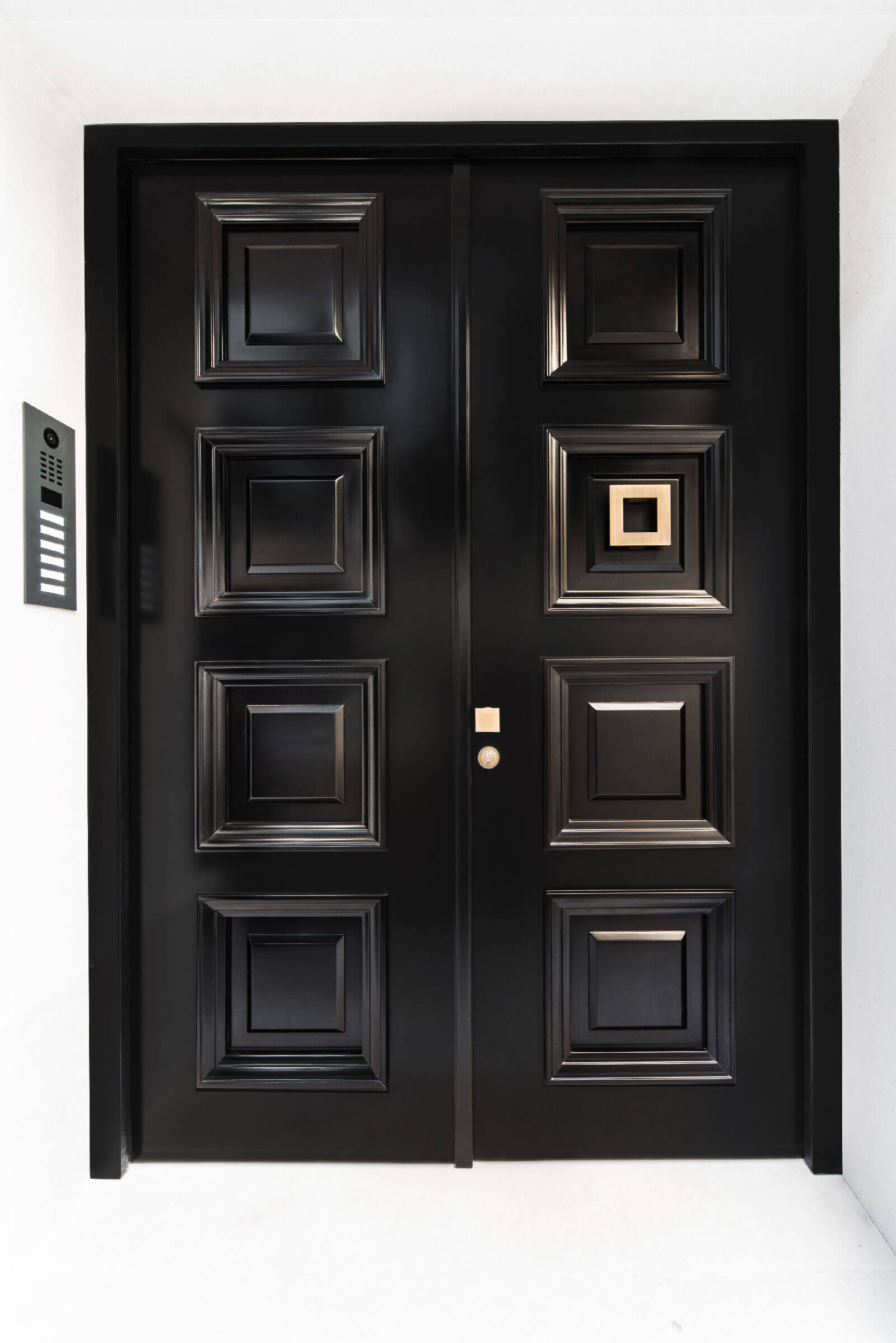 Enterijerom dominiraju elegantna crna vrata sa profilacijama i lajsnama, koja se stapaju sa zidovima u istoj nijansi, čime se dodatno naglašava osjećaj sofisticiranosti i ekskluzivnosti. Kombinacija crnog medijapana i hrastovog furnira donosi savršen balans između modernog izraza i prirodne topline drveta.