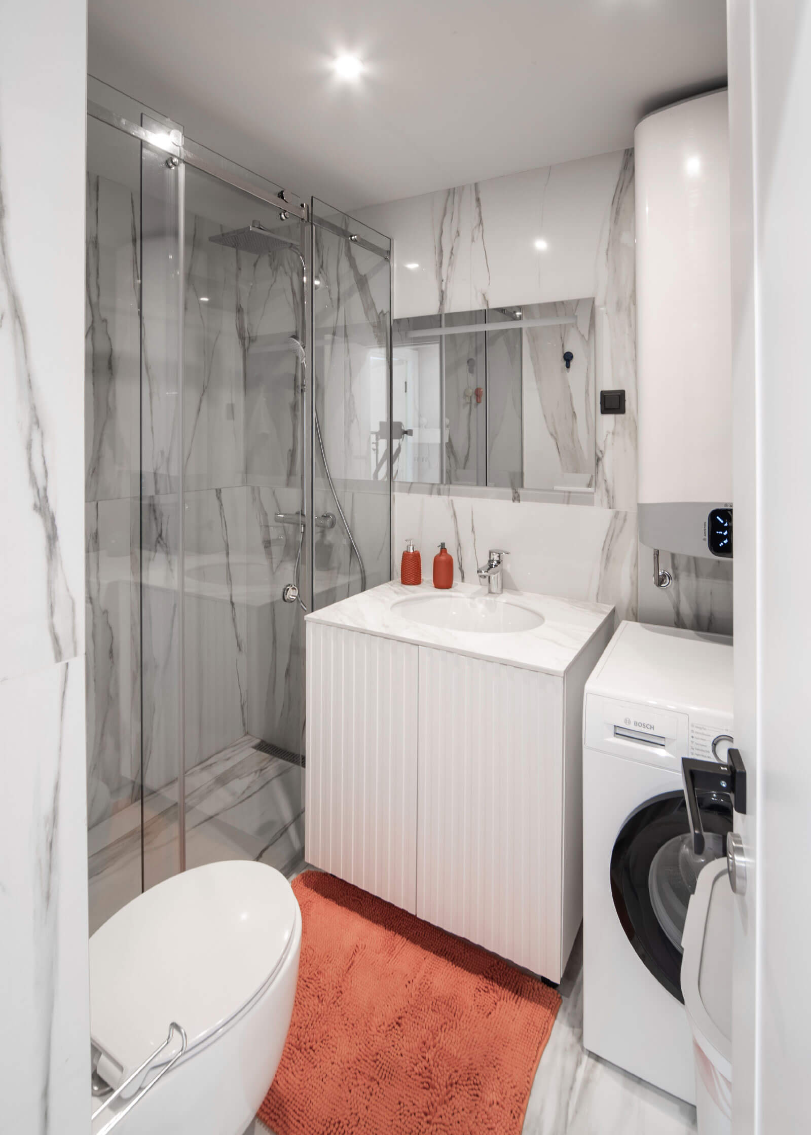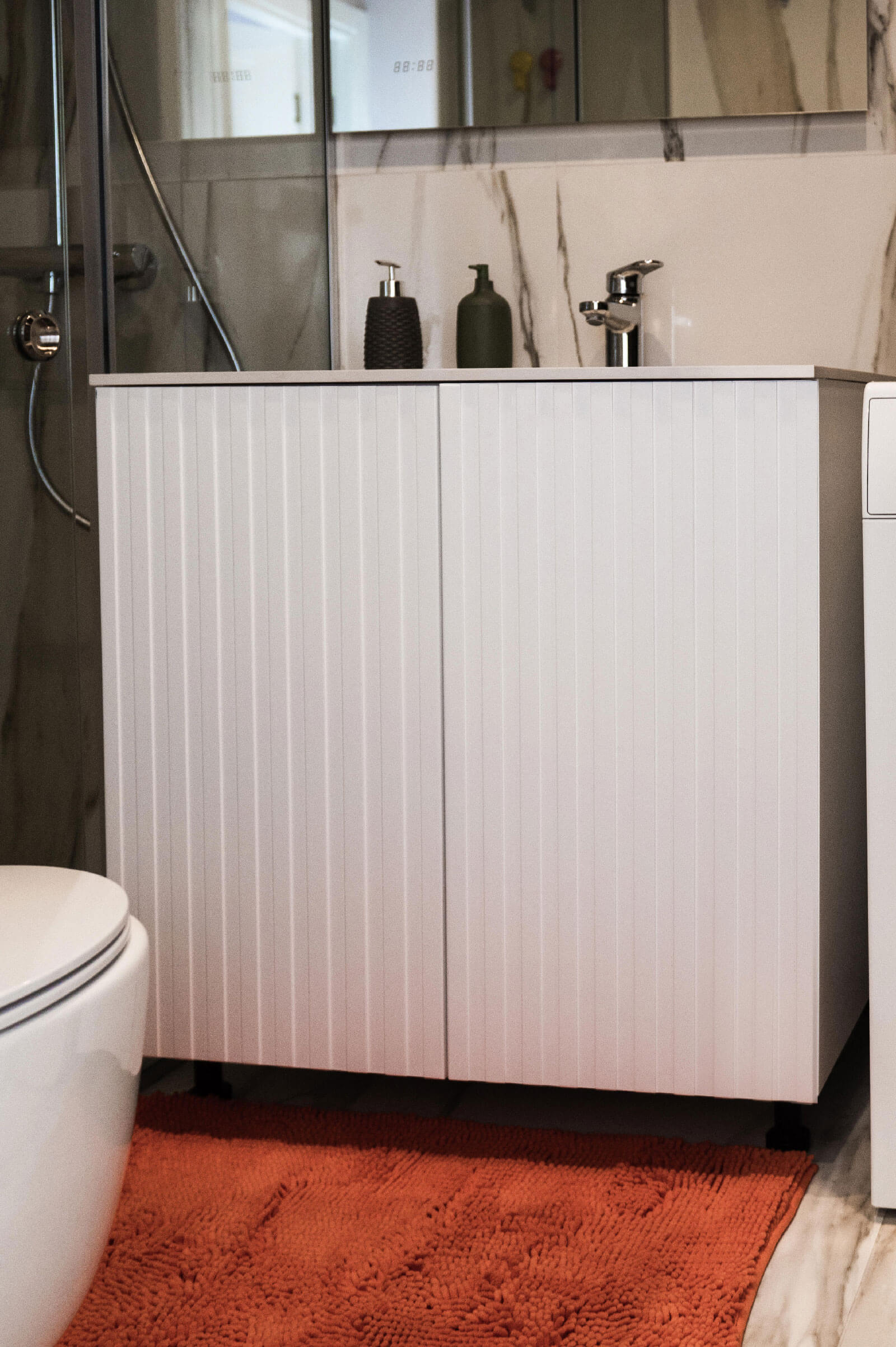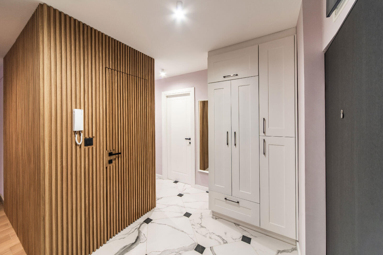 Detalji poput vertikalnih letvica i skrivenih vrata doprinose savremenom izrazu i vizuelnoj dinamici, čineći svaki element enterijera funkcionalnim, a istovremeno estetski privlačnim.
