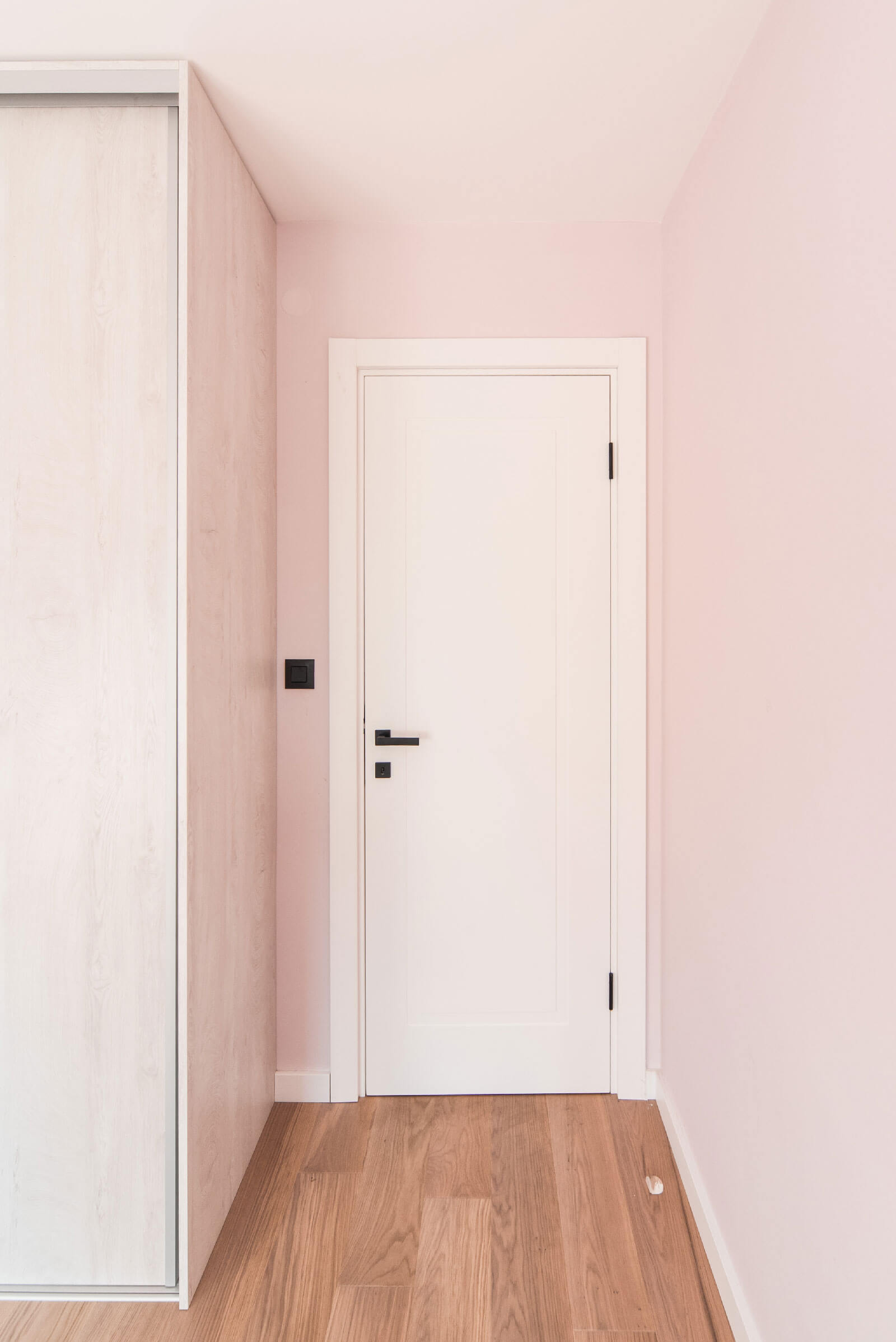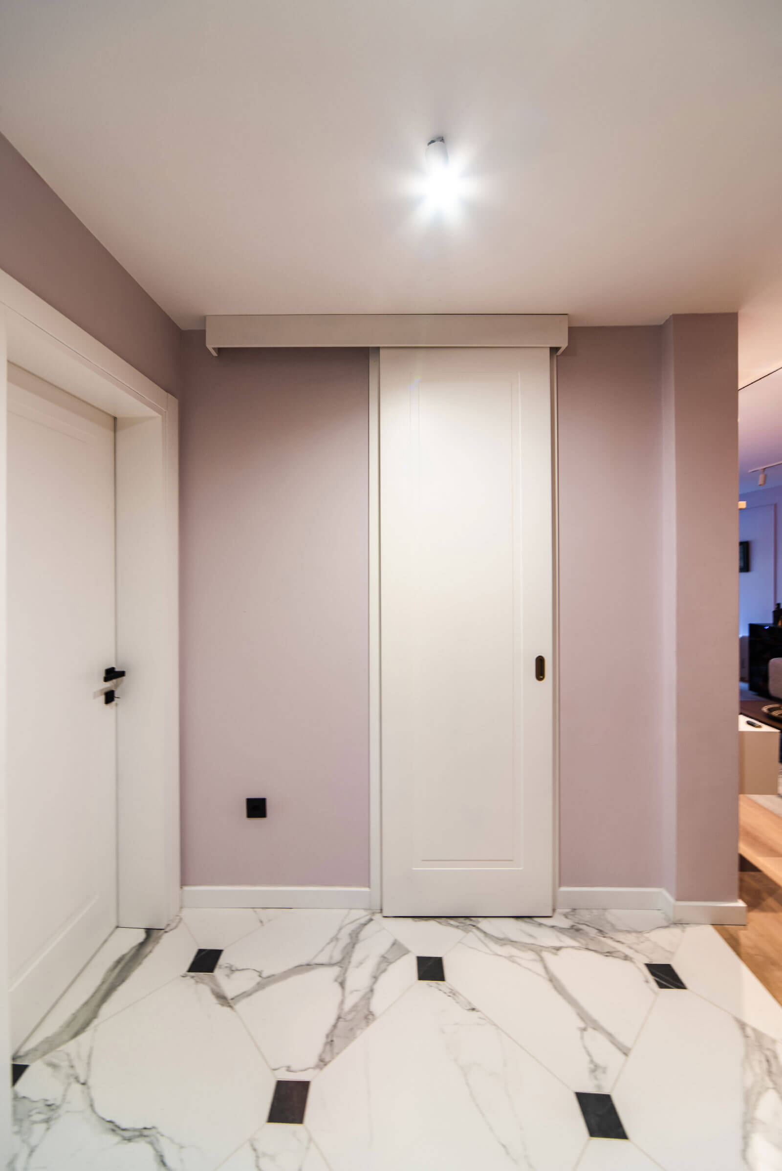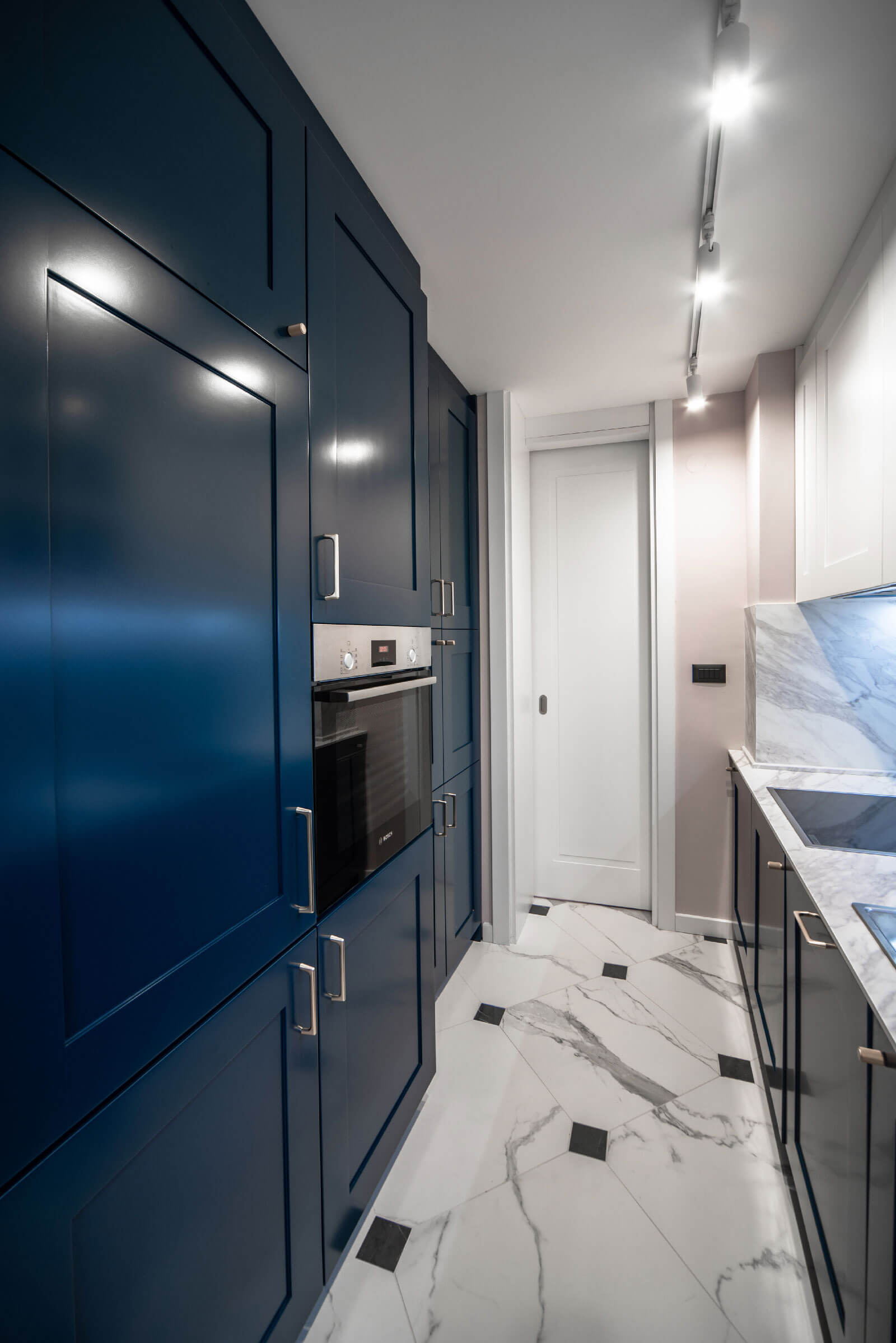 Enterijer ovog stana karakteriše moderna kombinacija boja i materijala. Kuhinja je izvedena u tamno plavom medijapanu, koji je u kontrastu sa bijelim medijapanom prisutnim u ostatku stana, dok hrastov furnir unosi toplinu i prirodni šarm u prostor.
