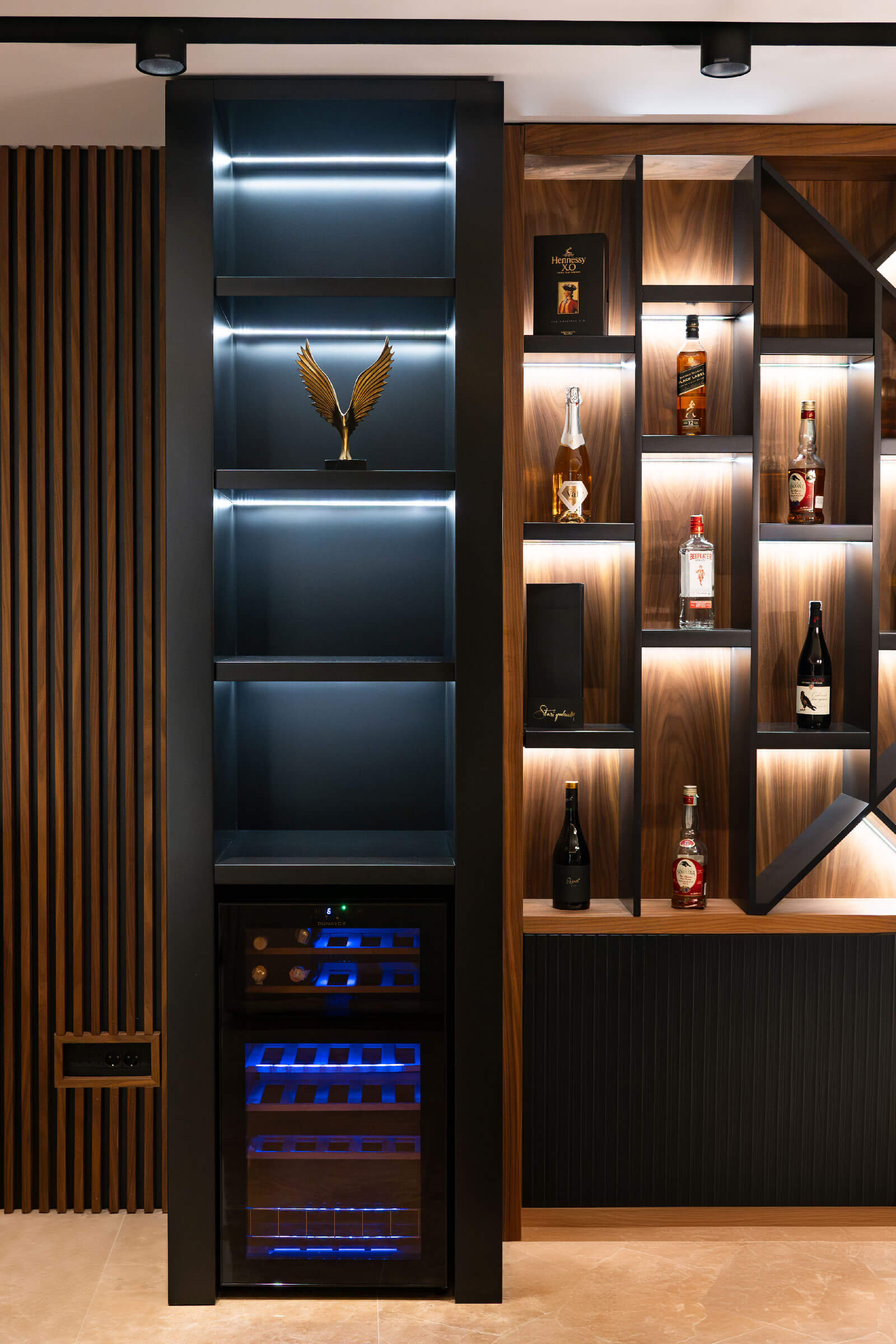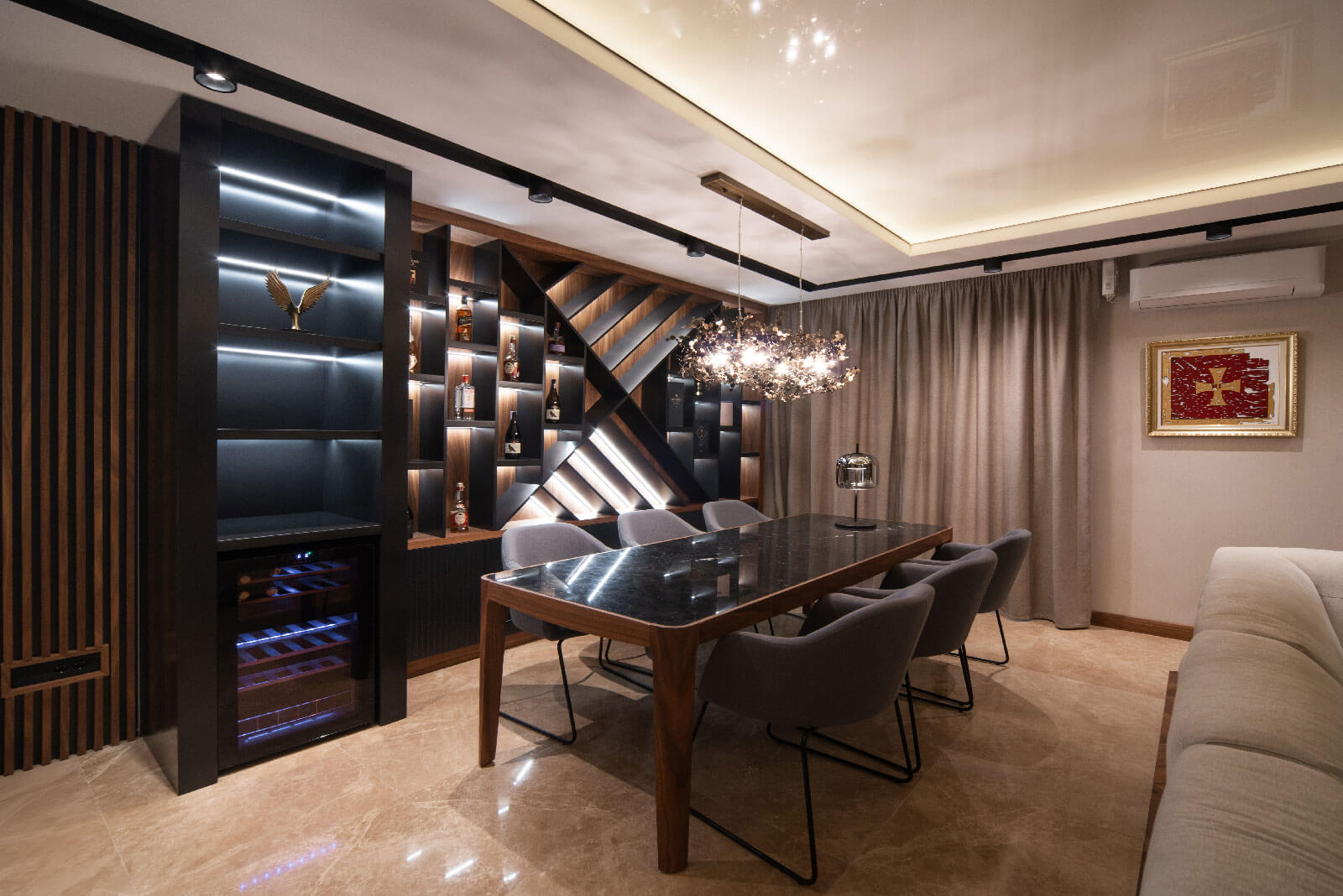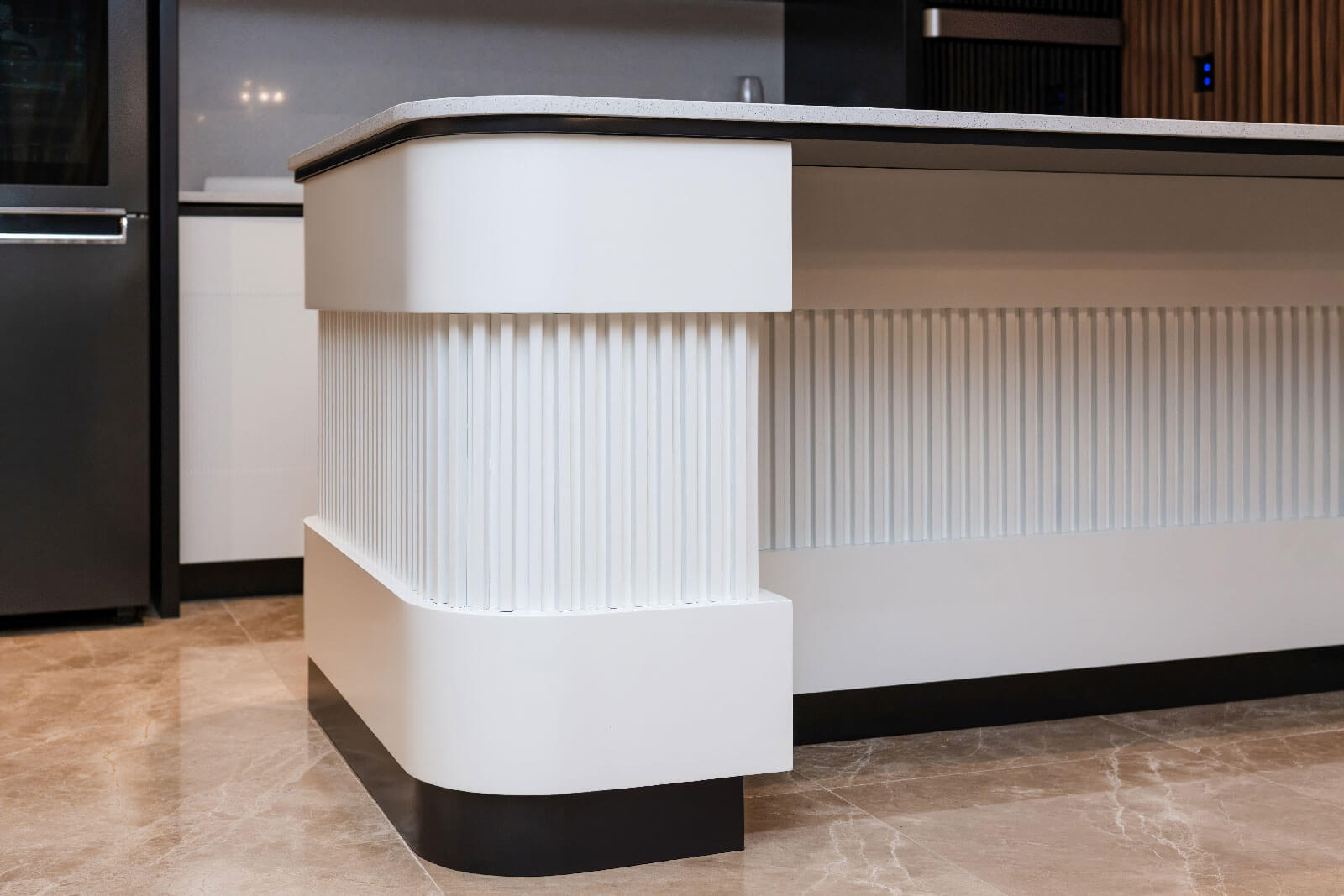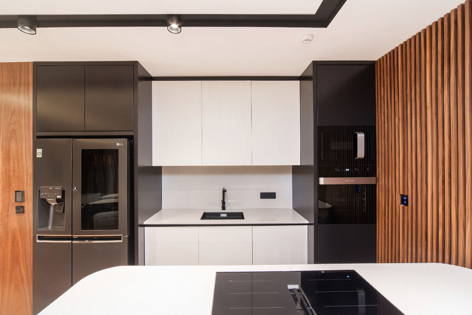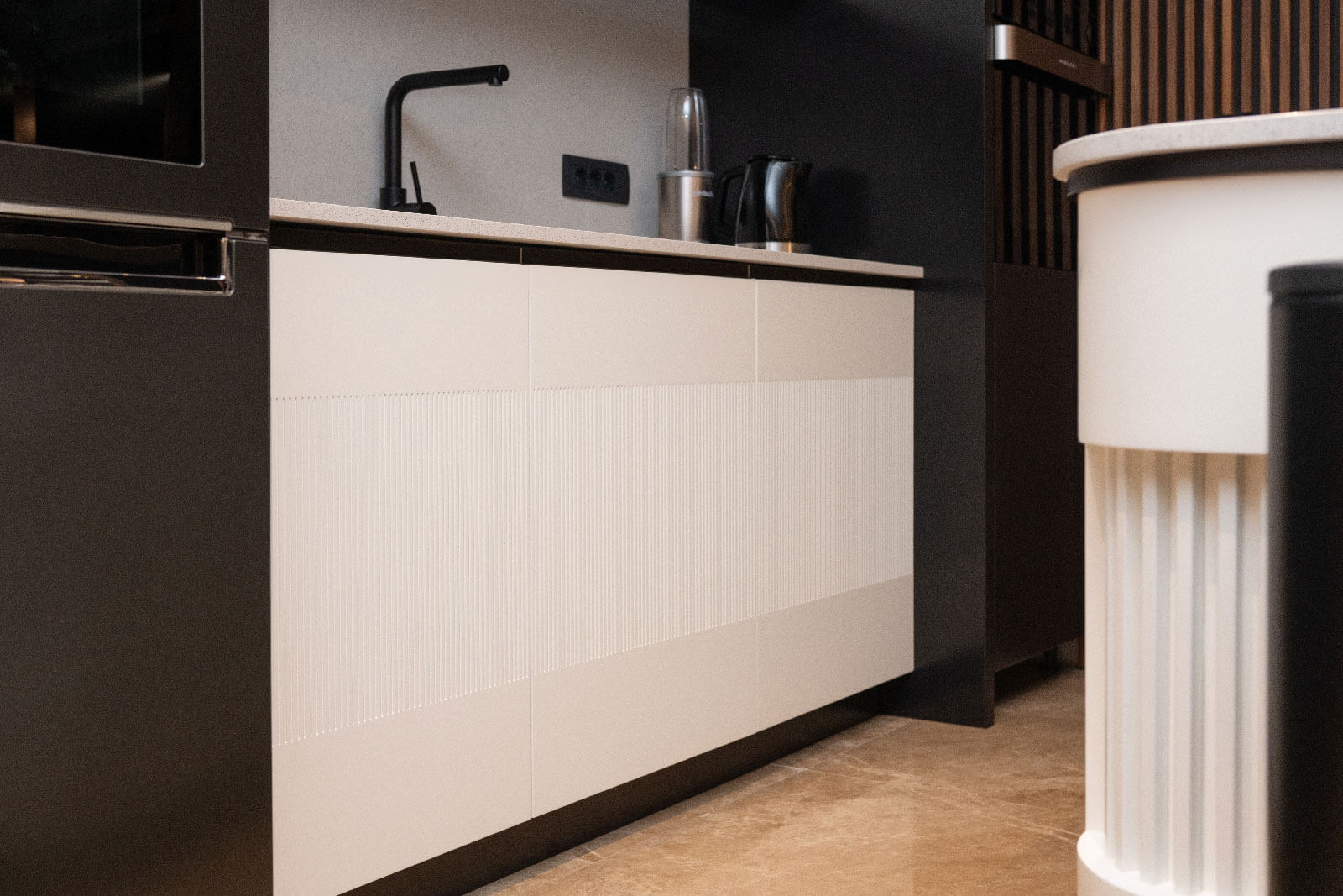 Kuhinja je izvedena u kombinaciji crnog i bijelog medijapana, obogaćena dekorativnim vertikalnim letvicama koje prostoru daju dinamiku i savremen karakter. Ovaj prepoznatljiv dizajnerski element ponavlja se i na ormarima i komodama, čime je ostvarena vizuelna cjelina i dodatno naglašena unikatnost svakog komada namještaja.