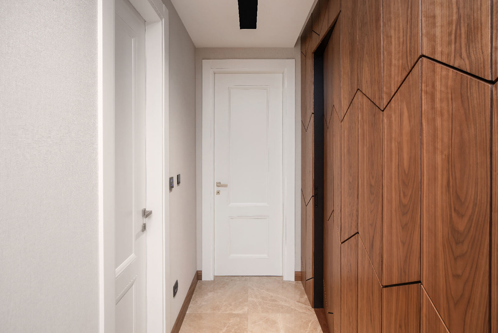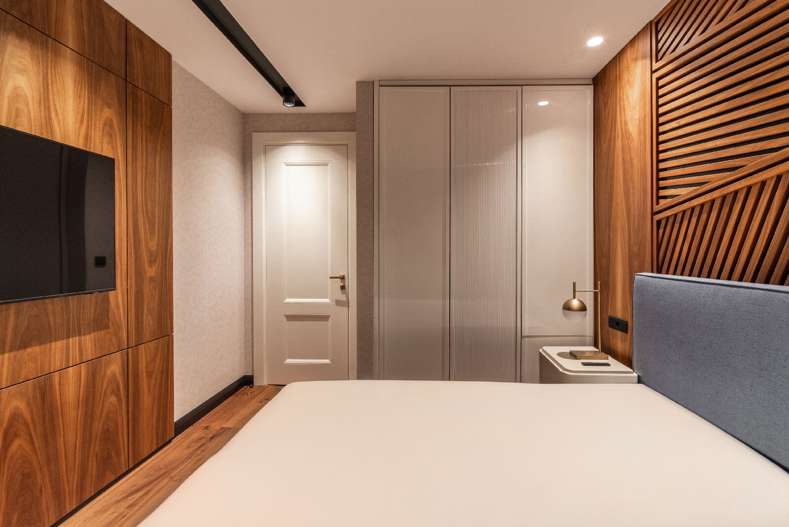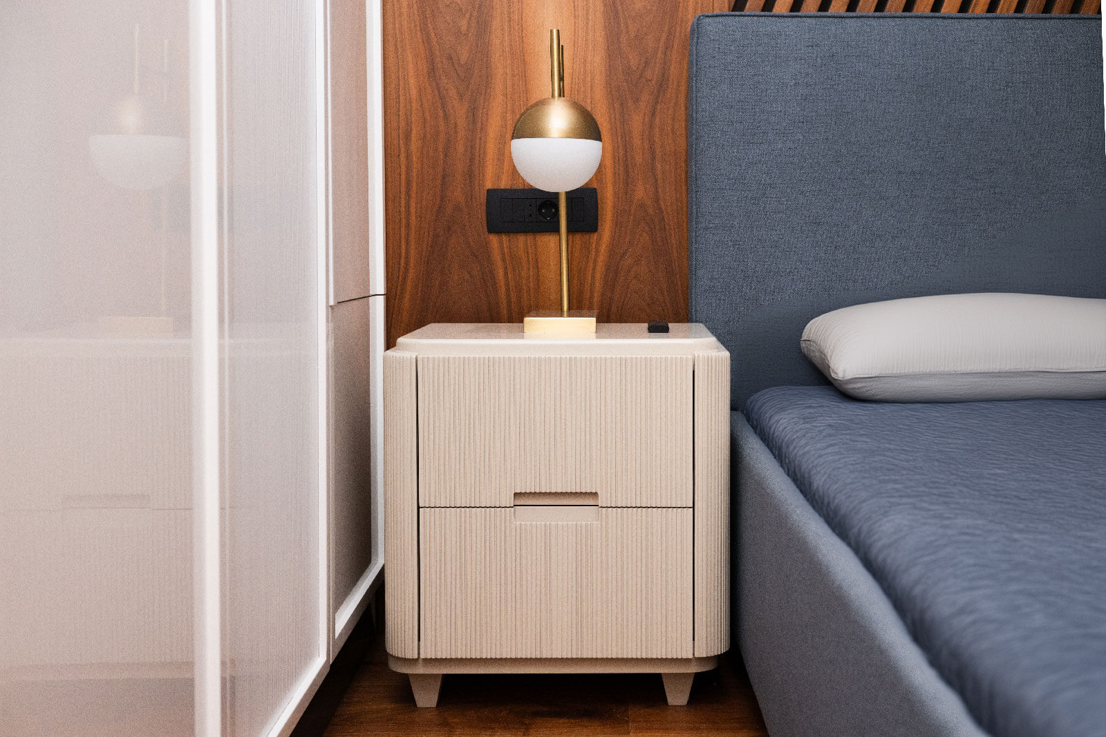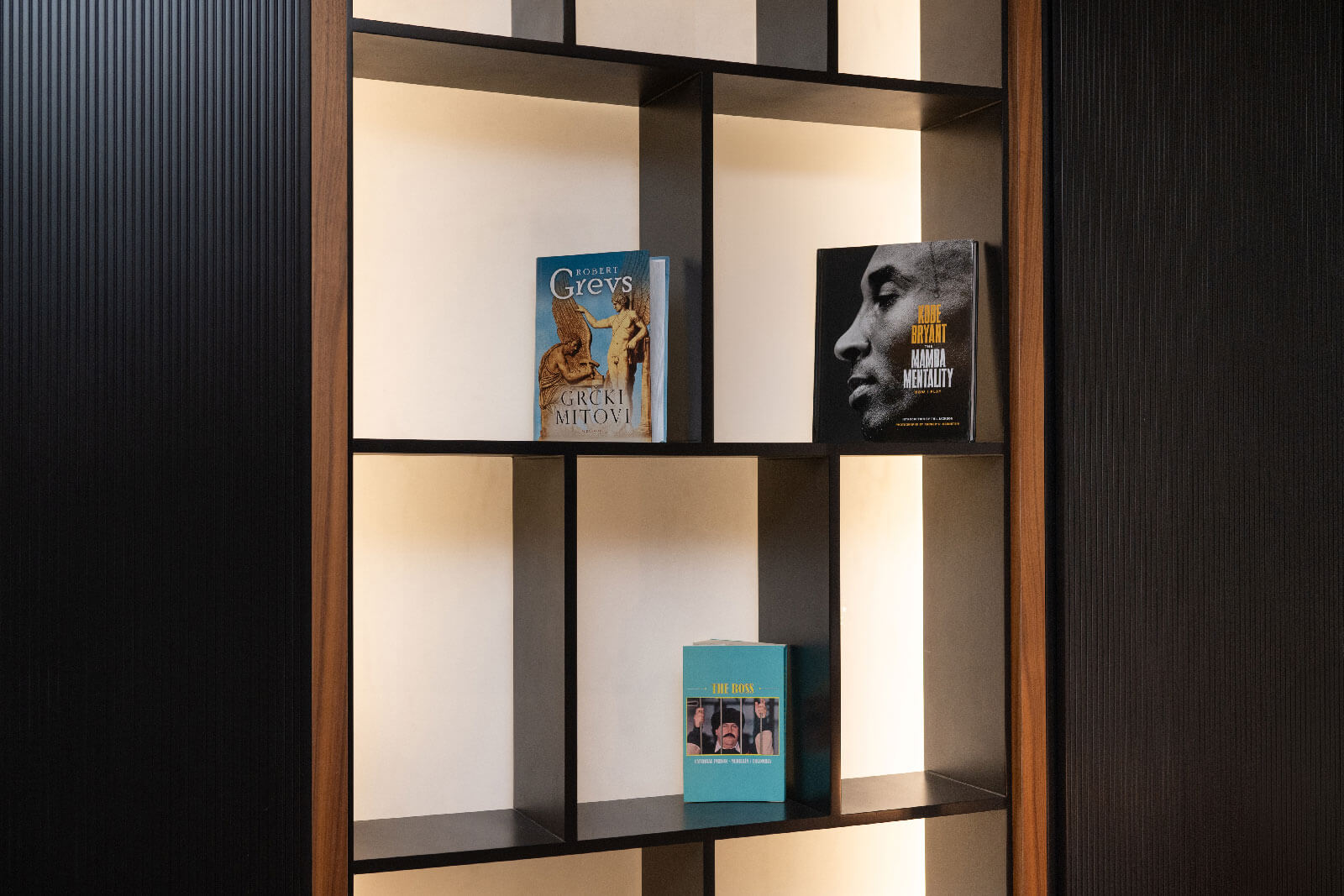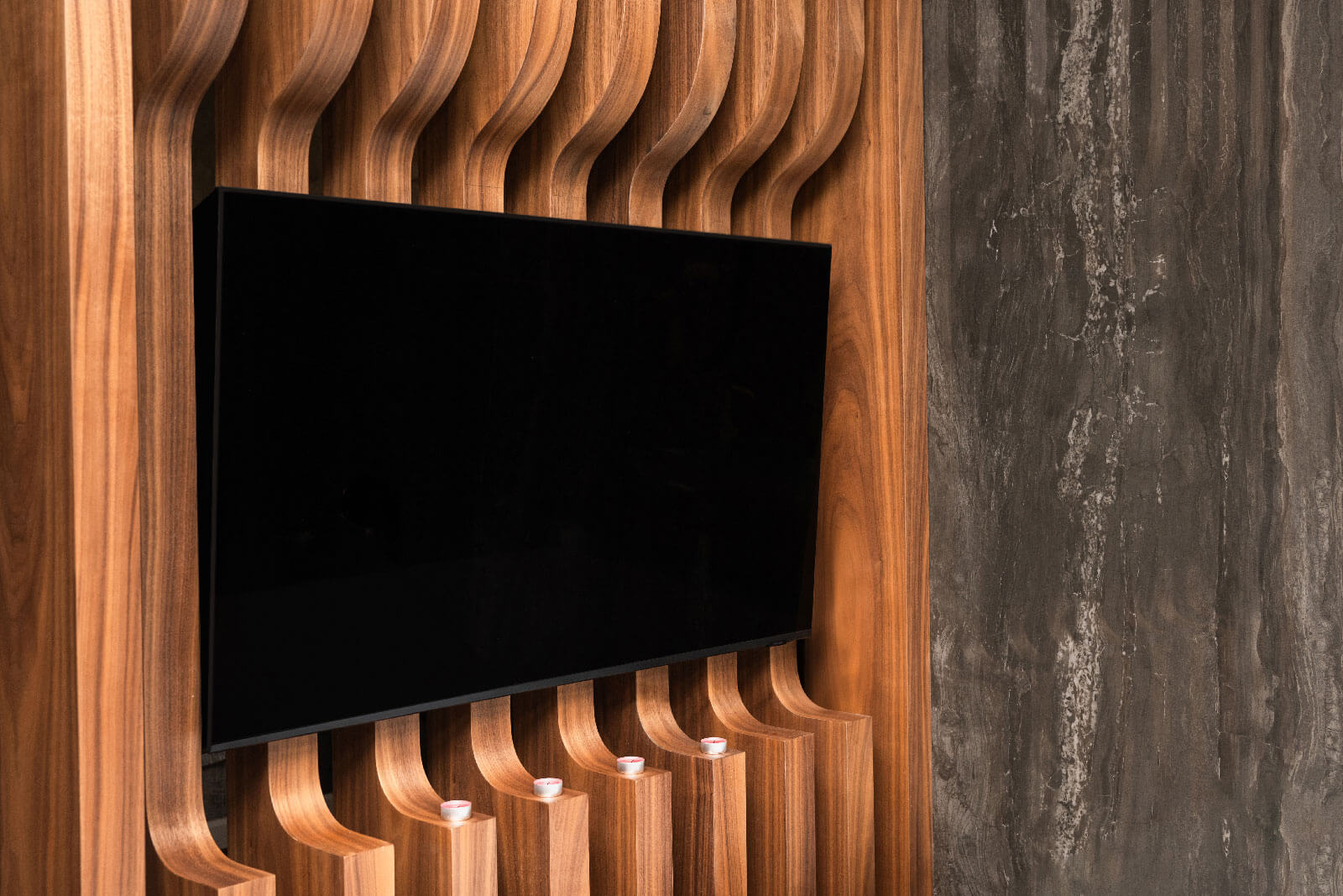 Stan je moderno opremljen pažljivo odabranom kombinacijom punog drveta, lakiranog medijapana i medijapana sa orahovim furnirom, dok su korpusi izrađeni od univera. Dominantan dezen američkog oraha diskretno se provlači kroz sve prostorije, unoseći toplinu i dozu sofisticirane elegancije u kompletan enterijer.