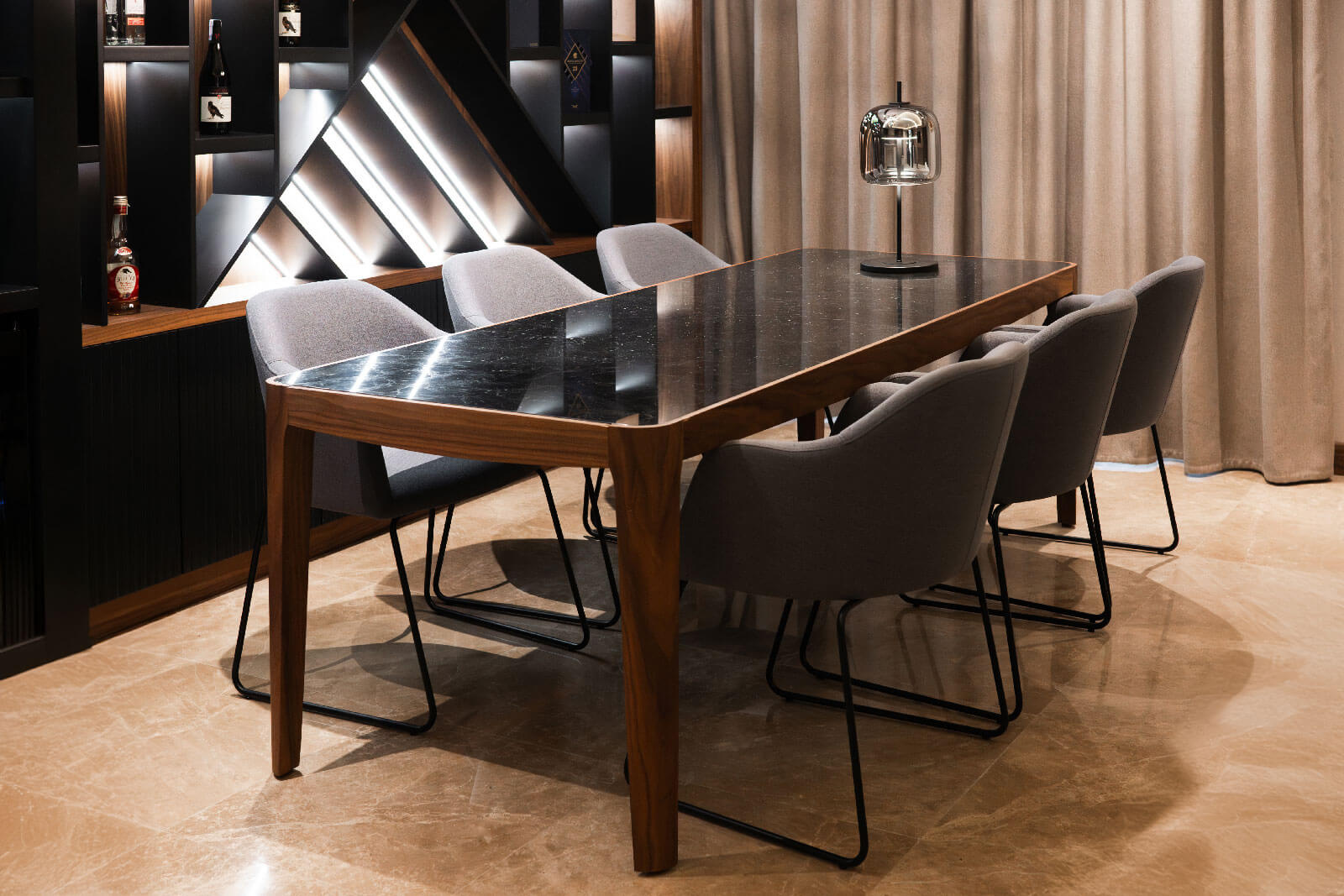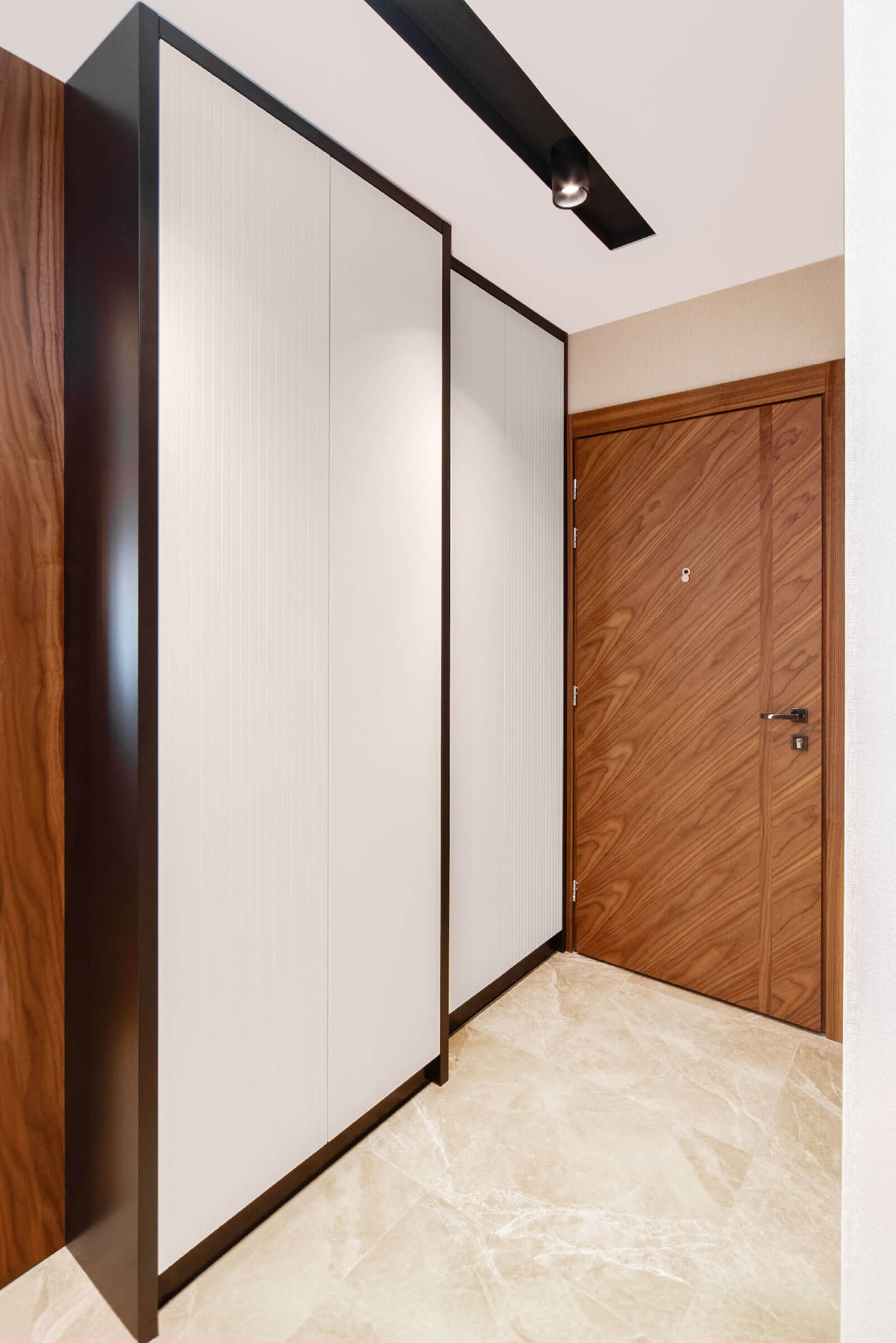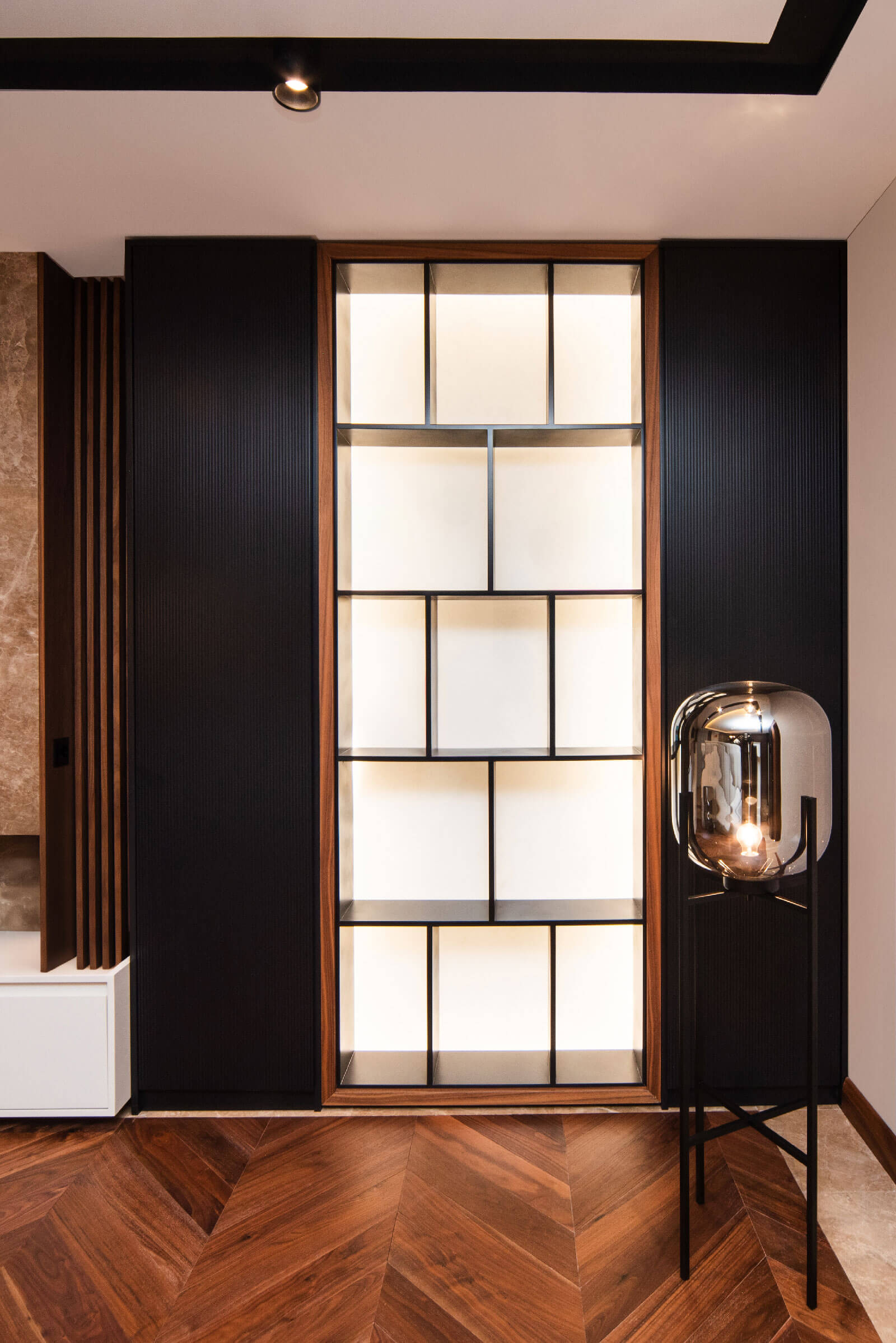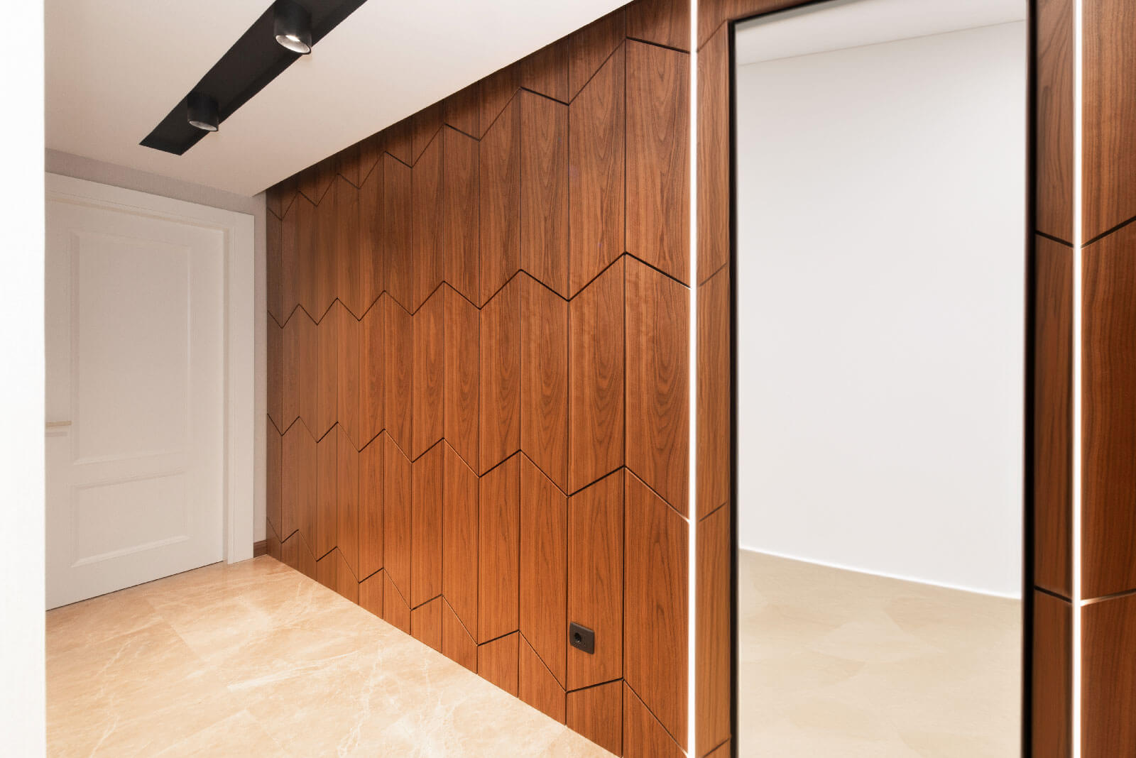 Stan je moderno opremljen pažljivo odabranom kombinacijom punog drveta, lakiranog medijapana i medijapana sa orahovim furnirom, dok su korpusi izrađeni od univera. Dominantan dezen američkog oraha diskretno se provlači kroz sve prostorije, unoseći toplinu i dozu sofisticirane elegancije u kompletan enterijer.