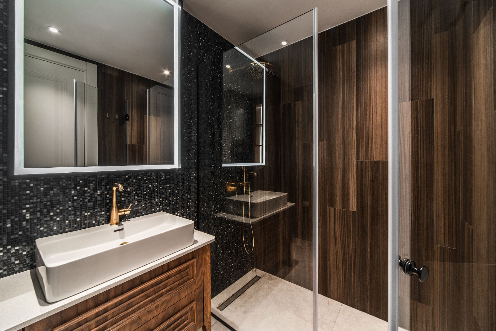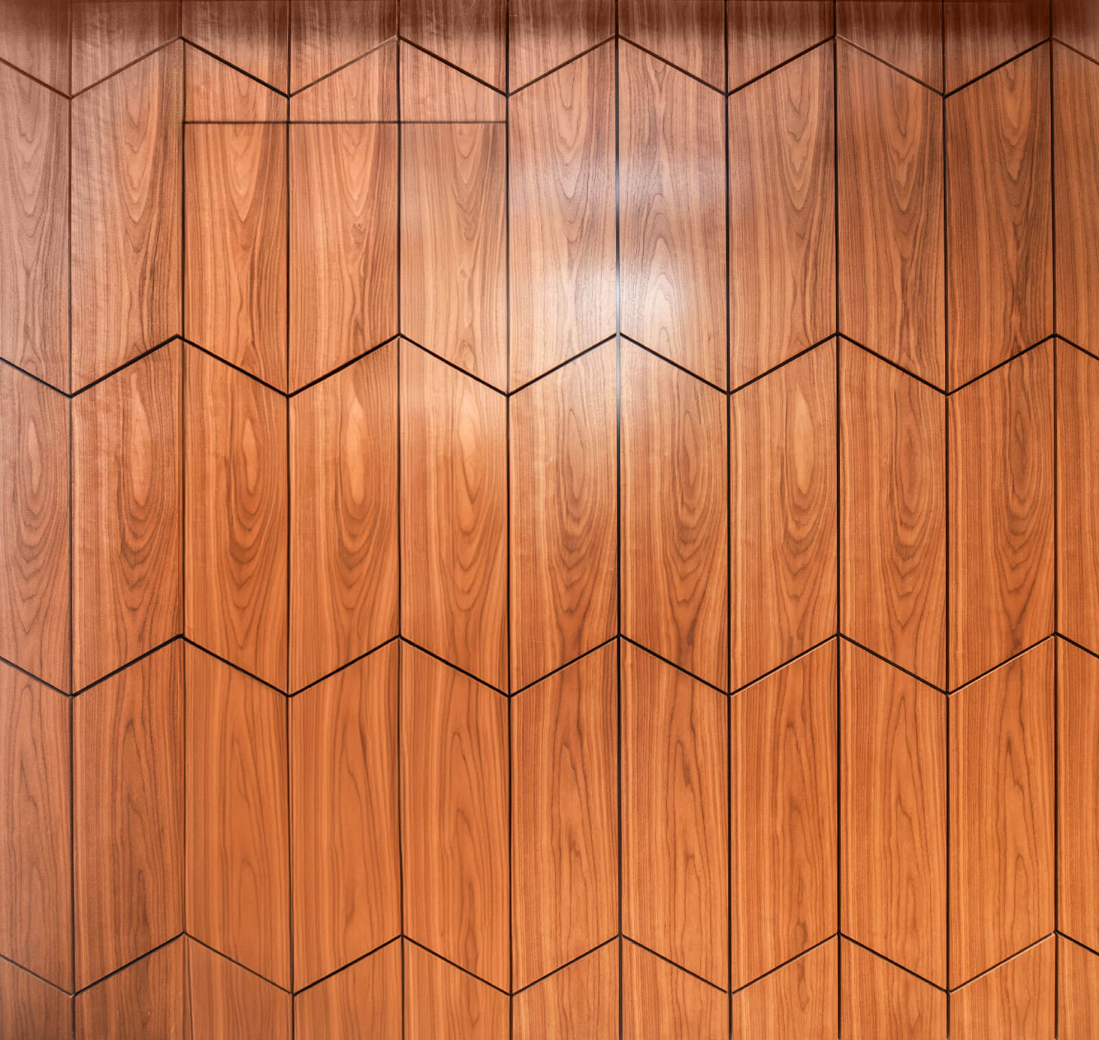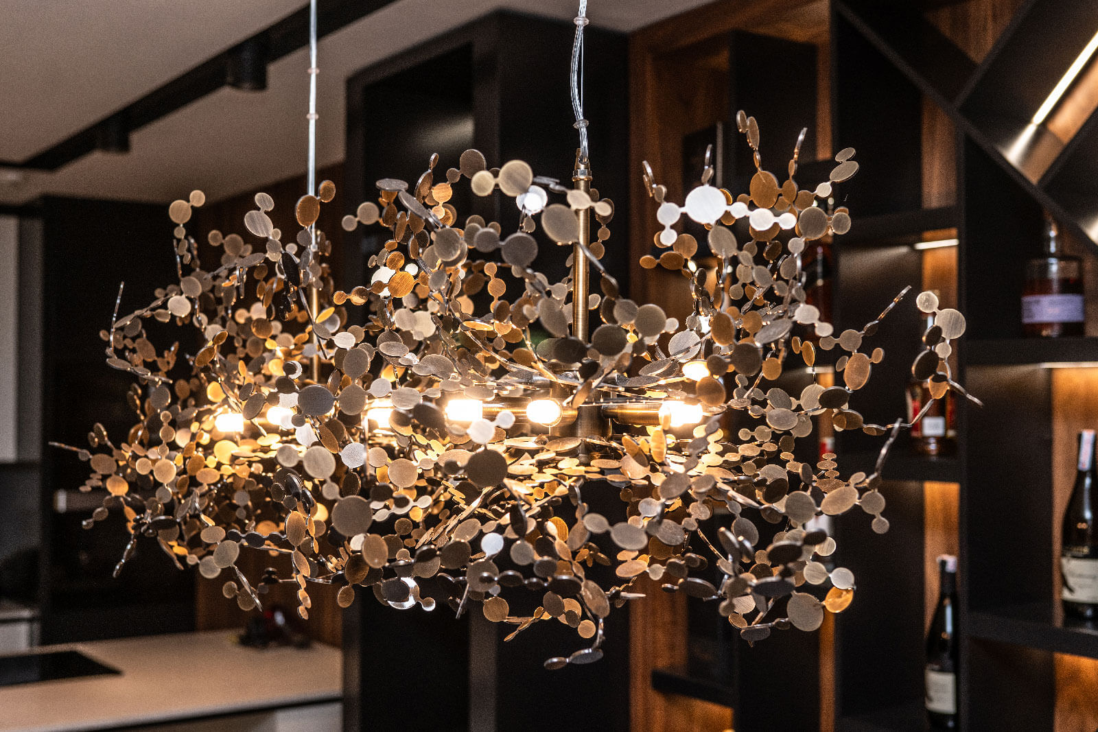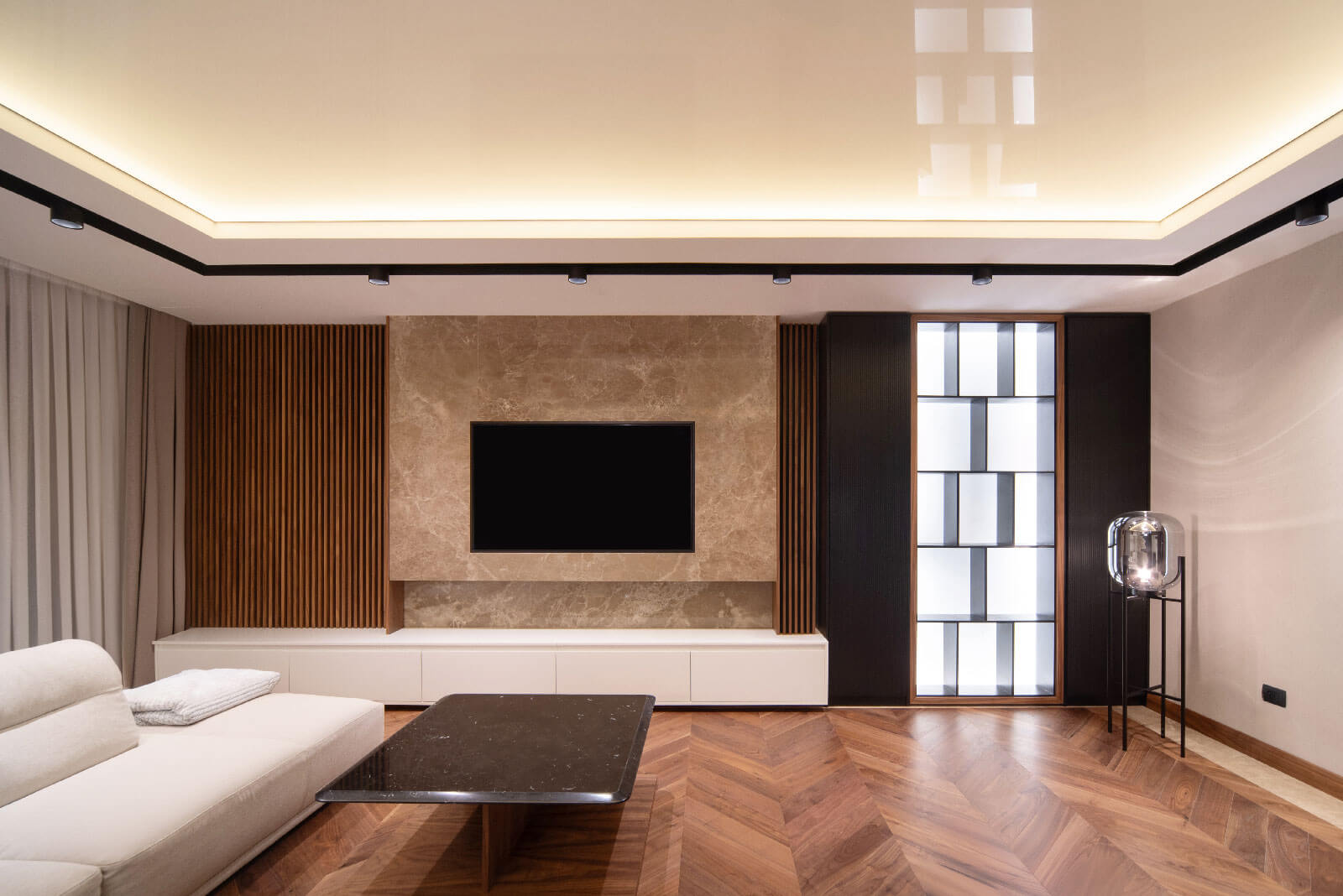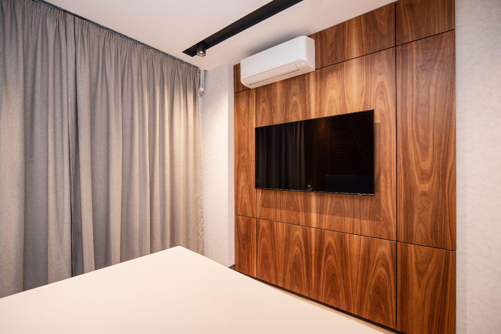 Stan je moderno opremljen pažljivo odabranom kombinacijom punog drveta, lakiranog medijapana i medijapana sa orahovim furnirom, dok su korpusi izrađeni od univera. Dominantan dezen američkog oraha diskretno se provlači kroz sve prostorije, unoseći toplinu i dozu sofisticirane elegancije u kompletan enterijer.